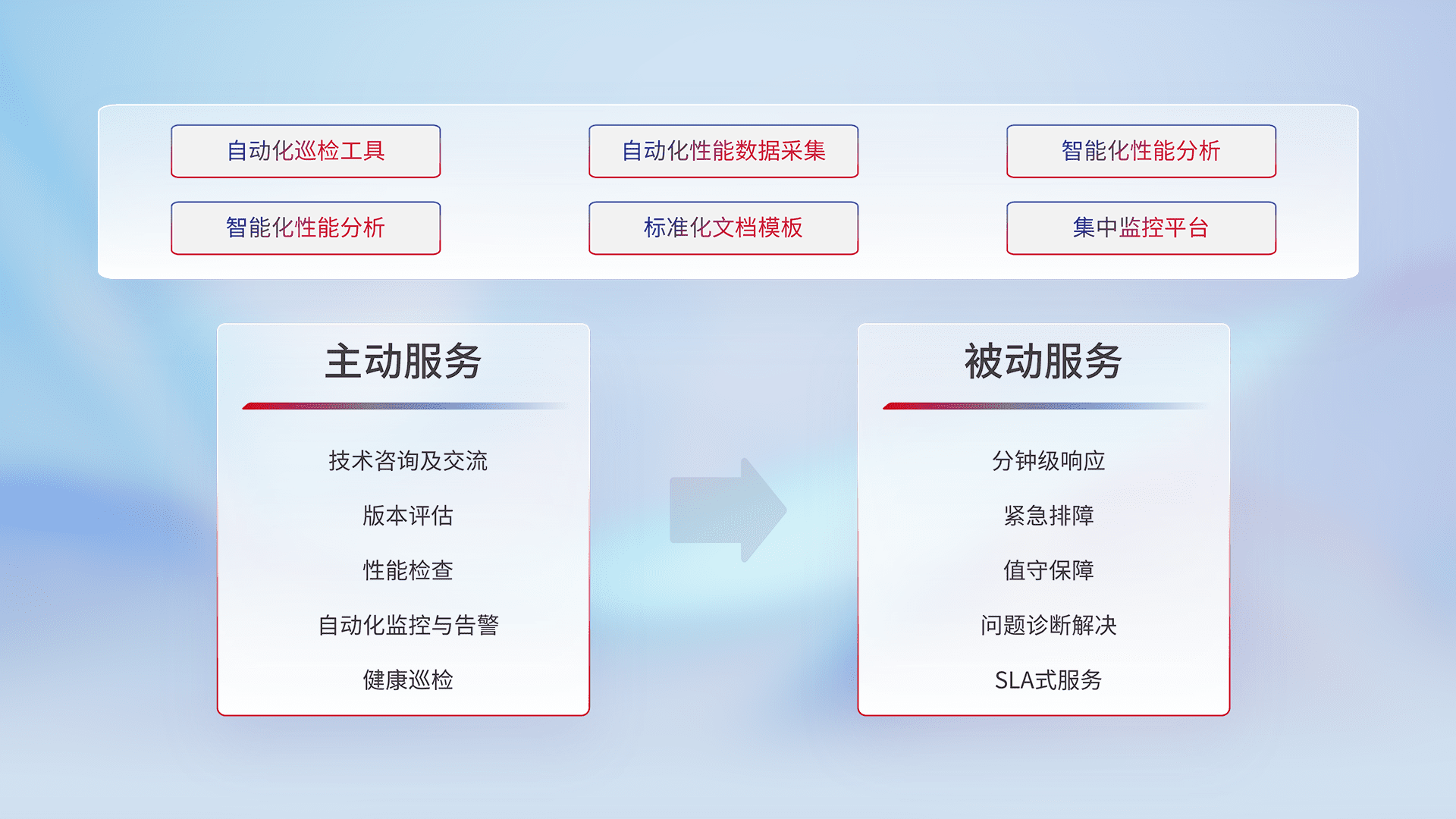 智能化工具和标准化文档,,,保障服务质量,,,提供主动服务(包含技术咨询、、、、版本评估、、、、性能检查、、自动化监控与告警、、健康巡检)和被动服务包含(分钟级响应、、紧急排障、、、、值守保障、、、、问题诊断解决、、SLA服务)。。